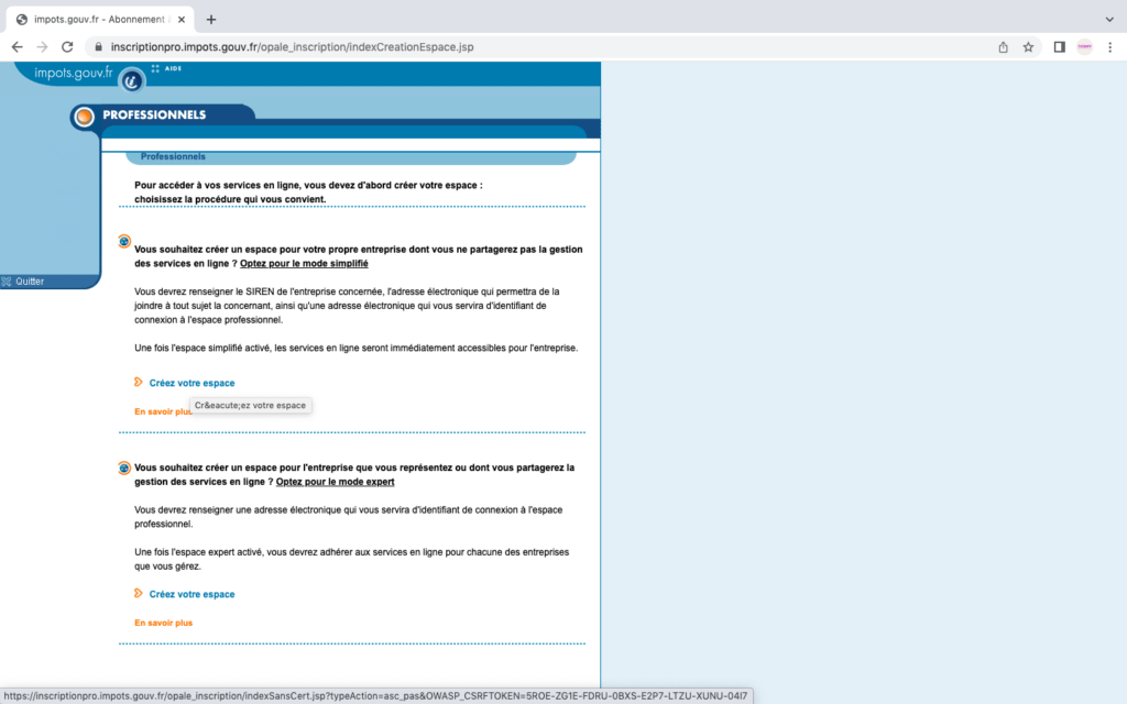 Pour finaliser l’ouverture de ton compte PRO clique sur le lien envoyé par mail par le service impots.gouv suite à la validation de ton inscription.