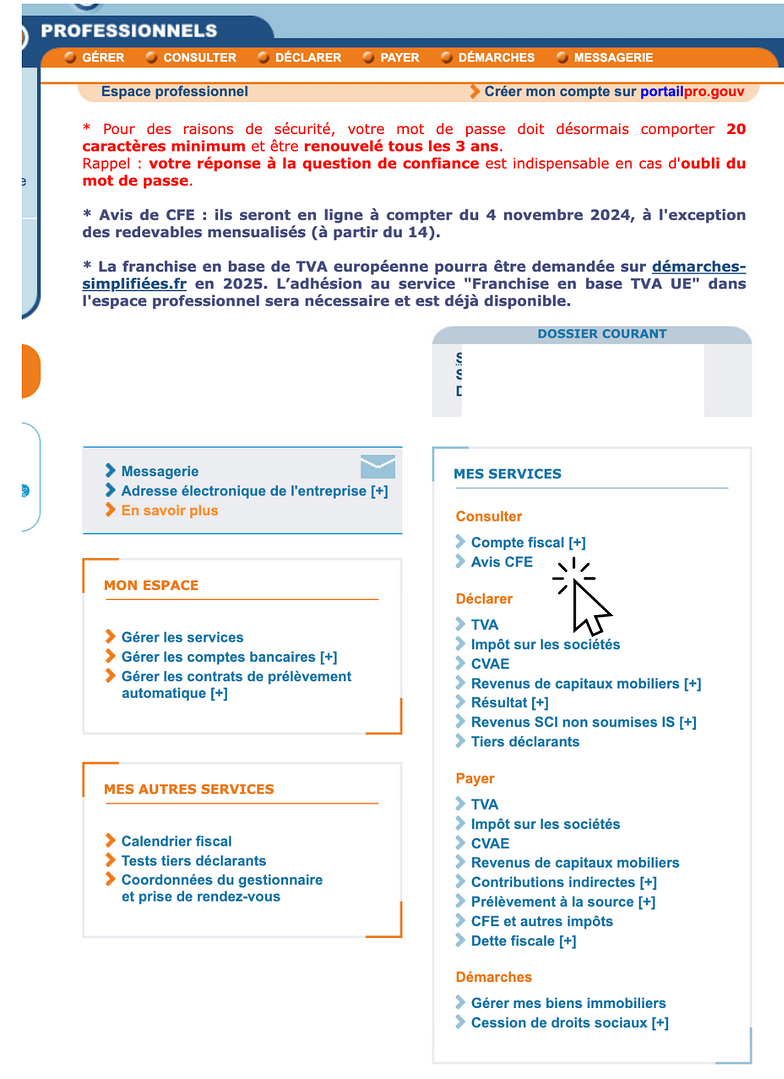 Pour retrouver tes avis de CFE il te suffit de te rendre sur ton espace impots.gouv.fr dans la rubrique MES SERVICES et Avis de CFE.